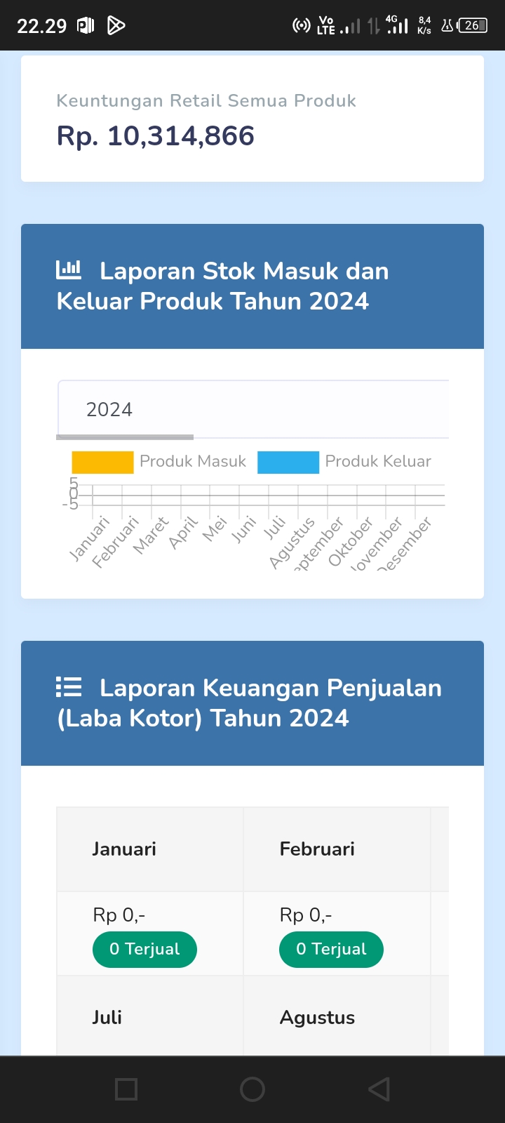 Output laporan ini dapat di ekspor ke format PDF maupun excel, terdiri dari laporan penjualan, pembelian, terlaris, dan cash flow usaha